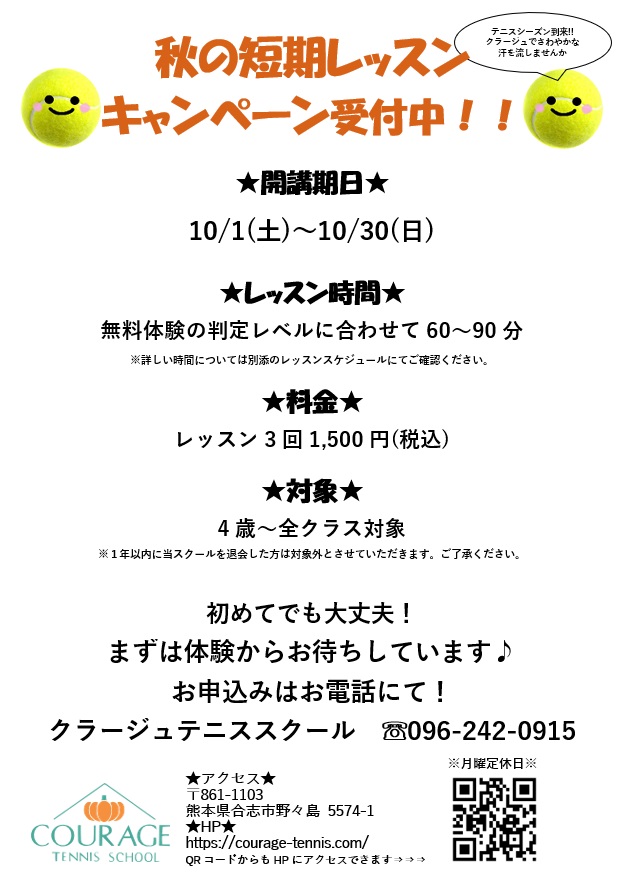 クラージュではこのテニスにもってこいの季節に、秋のキャンペーンとして短期レッスンの受付を開始いたします!